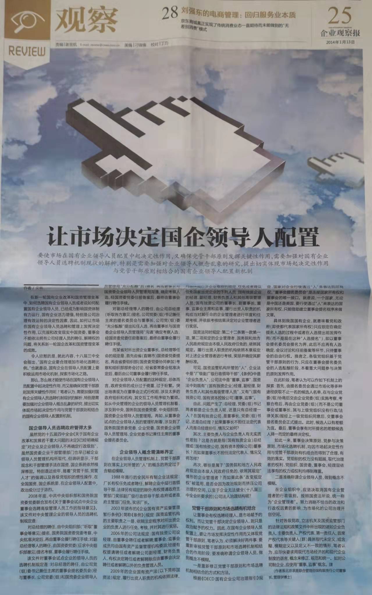 2014年1月,求是咨詢董事長、《改革內(nèi)參》特約研究員安林博士特邀在《改革內(nèi)參》(綜合01/24)發(fā)表了一篇重要文章:《讓“市場(chǎng)”在國企領(lǐng)導(dǎo)人配置中起決定性作用》。文中通過研究大膽提出“讓董事會(huì)差額選聘經(jīng)理人”的改革主張。后又通過建言和提案等形式積極向上反映。