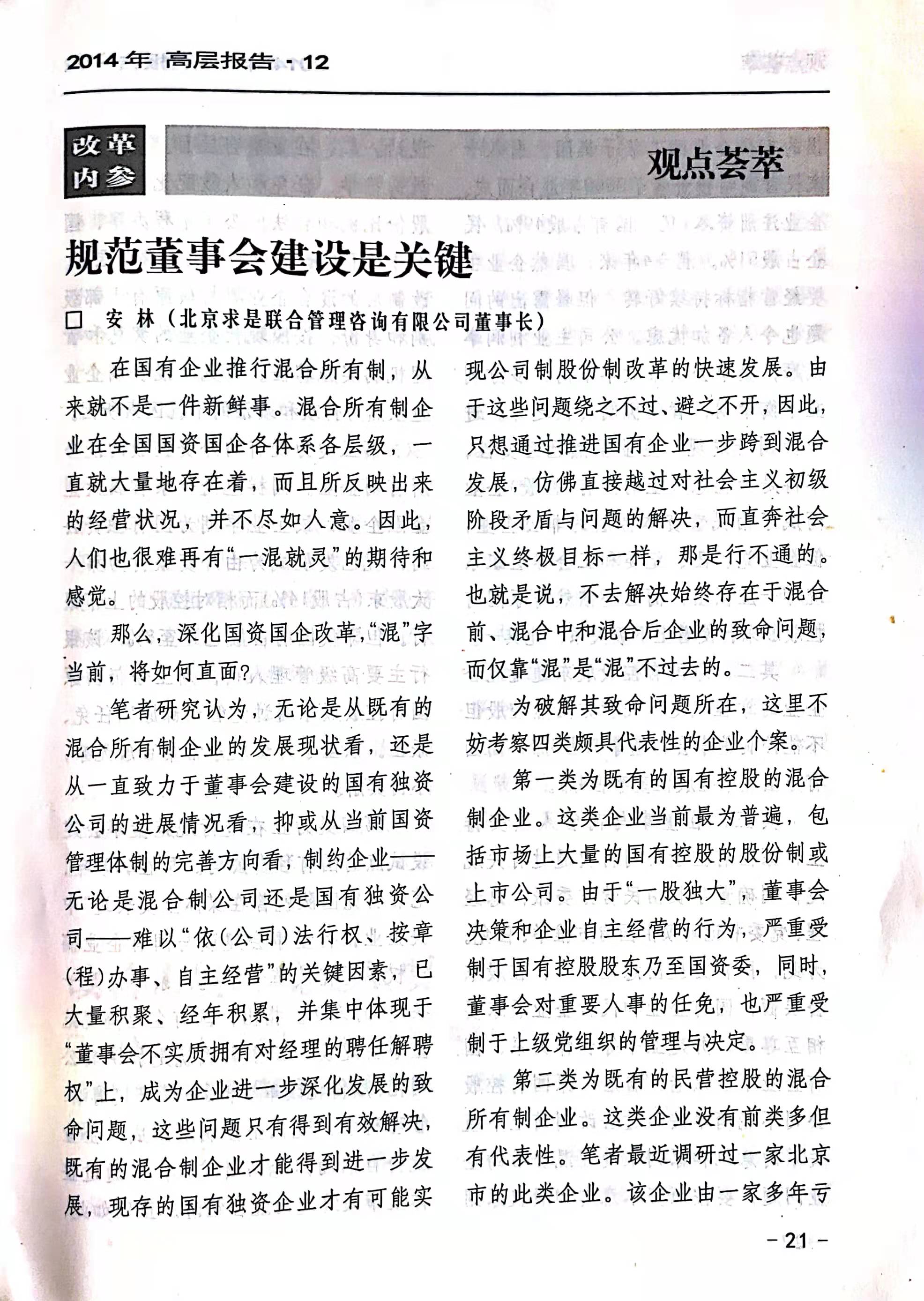 2014年6月,求是咨詢董事長、《改革內(nèi)參》特約研究員安林博士,應(yīng)邀為《改革內(nèi)參》撰寫特約文章:《規(guī)范董事會(huì)建設(shè)是關(guān)鍵》。