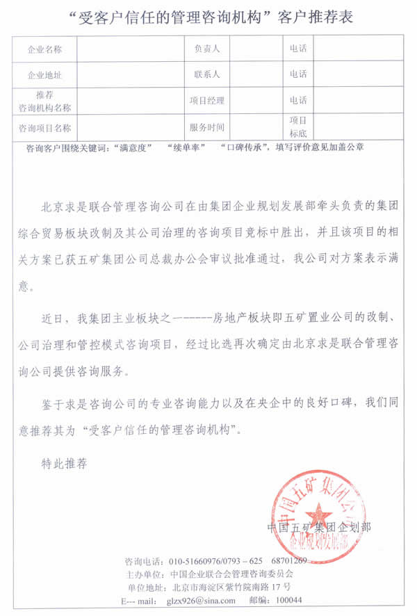 北京求是聯(lián)合管理咨詢公司在由集團企業(yè)規(guī)劃發(fā)展部牽頭負責的集團結(jié)合貿(mào)易板塊改制及其公司治理的咨詢項目況標中勝出,并助該項目的相關(guān)方案已獲五礦集團公司總裁辦公會審議批準通過,我公司對方案表示滿意。