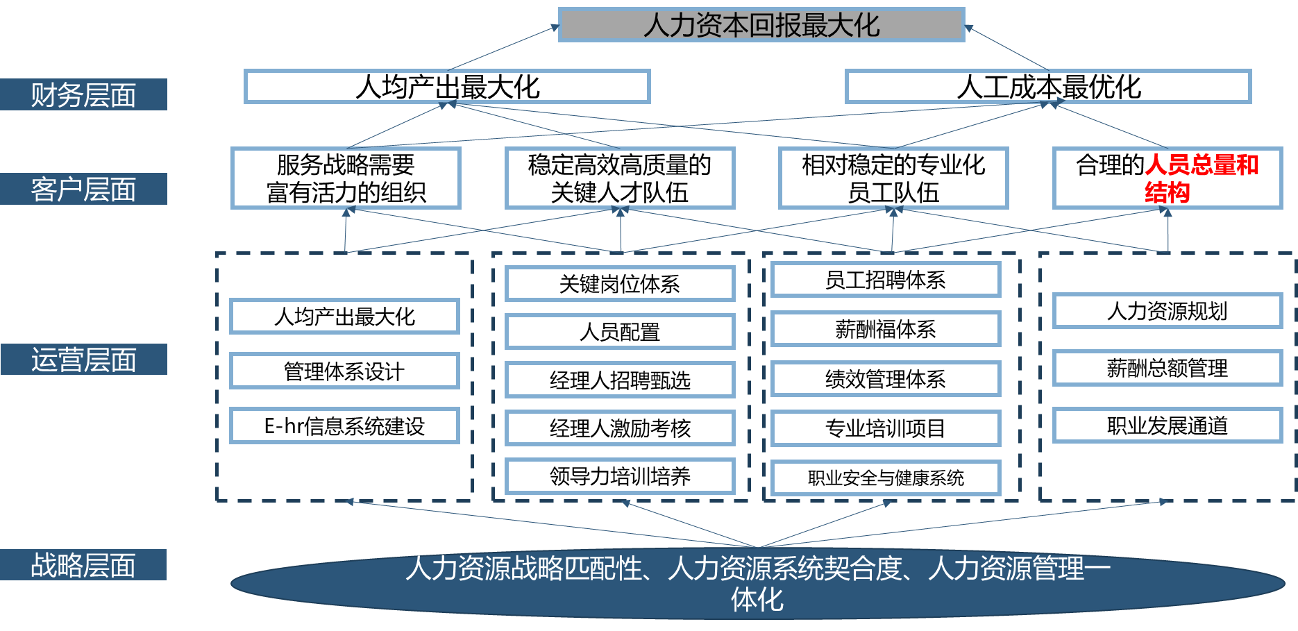 以公司經(jīng)營發(fā)展戰(zhàn)略為先導,遵循提高組織效率的原則,從企業(yè)發(fā)展階段、信息化水平、管理水平、員工能力、技術水平等實際出發(fā),運用科學的工具方法,按照宏觀微觀分層、崗位類別分類確定編制數(shù)量,達到合理設置崗位和分配人力資源、提高企業(yè)運營效率的目的。
