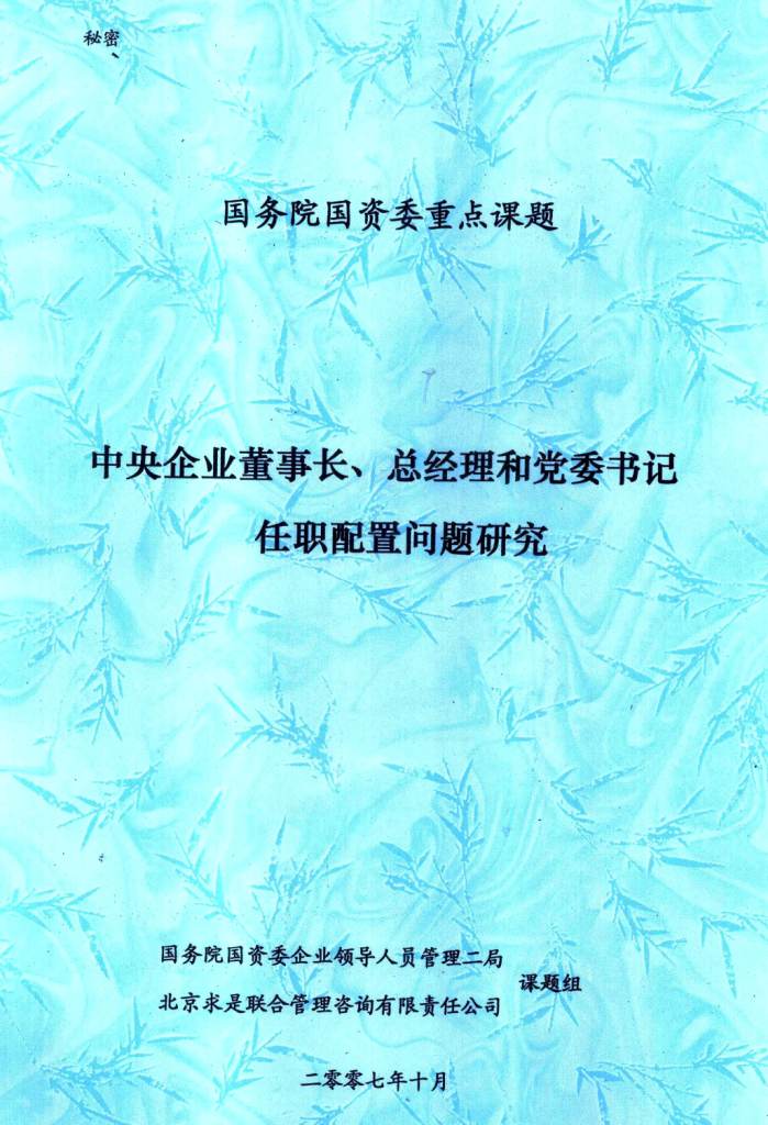 2006年,求是咨詢受國務(wù)院國資委企業(yè)領(lǐng)導(dǎo)人員管理二局邀請主持重點(diǎn)課題《中央企業(yè)董事長、總經(jīng)理和黨委書記任職配置問題研究》。