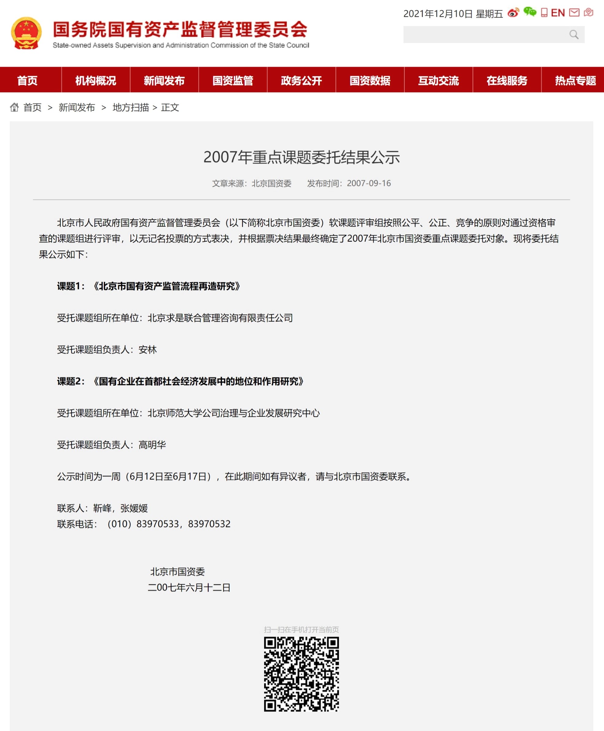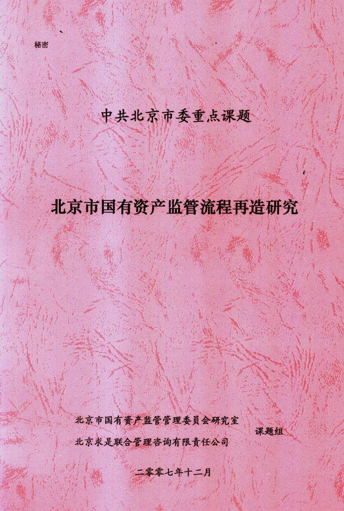 2007年6月,求是咨詢(xún)中標(biāo)北京市國(guó)資委重點(diǎn)課題《北京市國(guó)有資產(chǎn)監(jiān)管流程再造研究》。課題由時(shí)任北京市委常委、常務(wù)副市長(zhǎng)吉林牽頭負(fù)責(zé)。