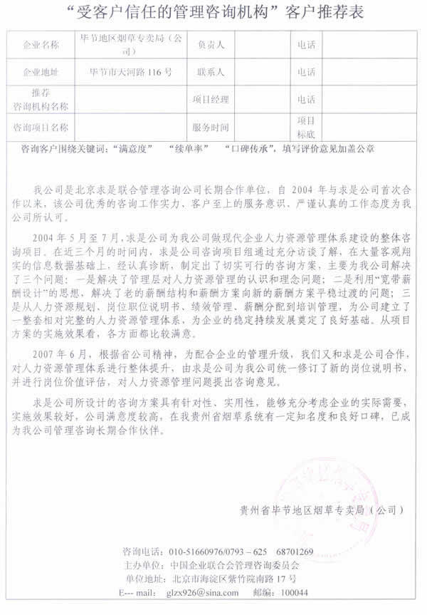 求是公司所設(shè)計的咨詢方案具有針對性,實用性,能夠充分考慮企業(yè)的實際需要,實施效果較好,公司滿意度較高,在我貴州省煙草系統(tǒng)有一定知名度和良好口碑,已成為我公司管理咨詢長期合作伙伴。
