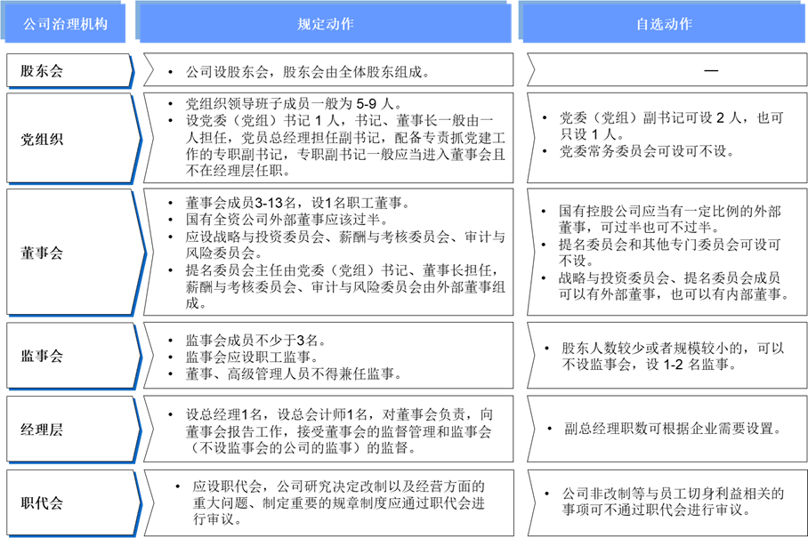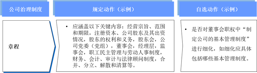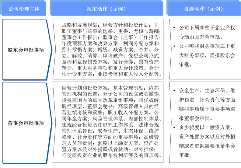 以中央企業(yè)(國有全資/控股公司)為例,《公司法》、《中央企業(yè)公司章程指引(試行)(國有全資/國有控股公司)》對(duì)公司《章程》的內(nèi)容,以及各公司治理主體的職權(quán)、會(huì)議召開、決策方式等提出了具體要求,這些屬于“規(guī)定動(dòng)作”;在這些具體要求之外,企業(yè)結(jié)合實(shí)際情況對(duì)各公司治理主體職權(quán)等進(jìn)行細(xì)化或補(bǔ)充完善,則屬于“自選動(dòng)作”。