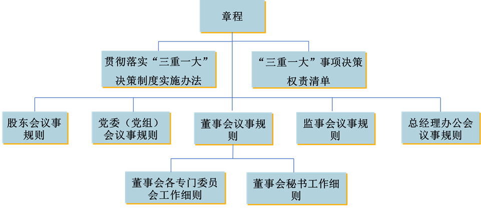 公司《章程》之外,企業(yè)還需要制定《股東會(huì)議事規(guī)則》、《黨委(黨組)會(huì)議事規(guī)則》、《董事會(huì)議事規(guī)則》、董事會(huì)各專門委員會(huì)工作細(xì)則、《監(jiān)事會(huì)議事規(guī)則》、《總經(jīng)理辦公會(huì)議事規(guī)則》、《董事會(huì)秘書工作細(xì)則》、《貫徹落實(shí)“三重一大”決策制度實(shí)施辦法》、《“三重一大”事項(xiàng)決策權(quán)責(zé)清單》等配套公司治理制度,對(duì)各治理主體職權(quán)、組織機(jī)構(gòu)、會(huì)議召開要求、議決程序、會(huì)議記錄、決議的執(zhí)行等進(jìn)行細(xì)化。