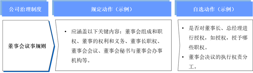 以中央企業(yè)(國有全資/控股公司)《董事會(huì)議事規(guī)則》為例,在公司《章程》中已經(jīng)明確了董事會(huì)組成和職權(quán)、董事的權(quán)利和義務(wù)、董事長(zhǎng)職權(quán)、董事會(huì)會(huì)議召開要求、董事會(huì)秘書與辦事機(jī)構(gòu),這些作為“規(guī)定動(dòng)作”必須在《董事會(huì)議事規(guī)則》中體現(xiàn),且相關(guān)內(nèi)容不得與公司《章程》相悖。此外,公司可以結(jié)合公司實(shí)際情況,增加董事會(huì)對(duì)董事長(zhǎng)、總經(jīng)理授權(quán)的職權(quán);結(jié)合董事會(huì)運(yùn)作需要增加所需支持與服務(wù)等內(nèi)容。