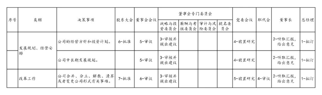 以中央企業(yè)(國有全資/控股公司)為例,公司治理相關(guān)法律、法規(guī)、政策文件中對(duì)各公司治理主體的職權(quán)已有許多明確的要求,這些是“規(guī)定動(dòng)作”,應(yīng)在相關(guān)公司治理制度中體現(xiàn)。此外,企業(yè)可結(jié)合所處行業(yè)及企業(yè)不同發(fā)展階段的特點(diǎn),細(xì)化“三重一大”決策事項(xiàng),并根據(jù)股東授權(quán)放權(quán)情況,明確相關(guān)事項(xiàng)的決策主體,明晰權(quán)責(zé)邊界。