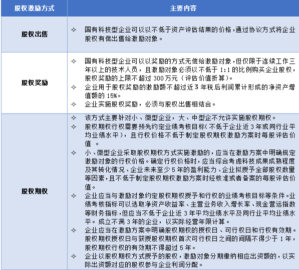 根據(jù)《關(guān)于印發(fā)國有科技型企業(yè)股權(quán)和分紅激勵暫行辦法的通知》(財資【2014】4號)一文,對國有科技型企業(yè)有以下說明:“本辦法所稱股權(quán)激勵,是指國有科技型企業(yè)以本企業(yè)股權(quán)為標的,采取股權(quán)出售、股權(quán)獎勵、股權(quán)期權(quán)等方式,對企業(yè)重要技術(shù)人員和經(jīng)營管理人員實施激勵的行為。”