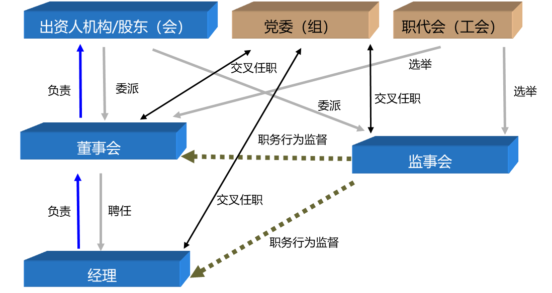 出資機構(gòu)/股東(會)是公司的最高權(quán)力機構(gòu),董事會是決策機構(gòu),經(jīng)理層是執(zhí)行機構(gòu),監(jiān)事會是監(jiān)督機構(gòu)。企業(yè)黨組織是公司治理的重要組成部分,參與決策、帶頭執(zhí)行、有效監(jiān)督,需要充分發(fā)揮黨組織的政治核心作用、領(lǐng)導(dǎo)核心作用。工會是黨聯(lián)系職工群眾的橋梁,企業(yè)職代會是企業(yè)實行民主管理的基本形式。