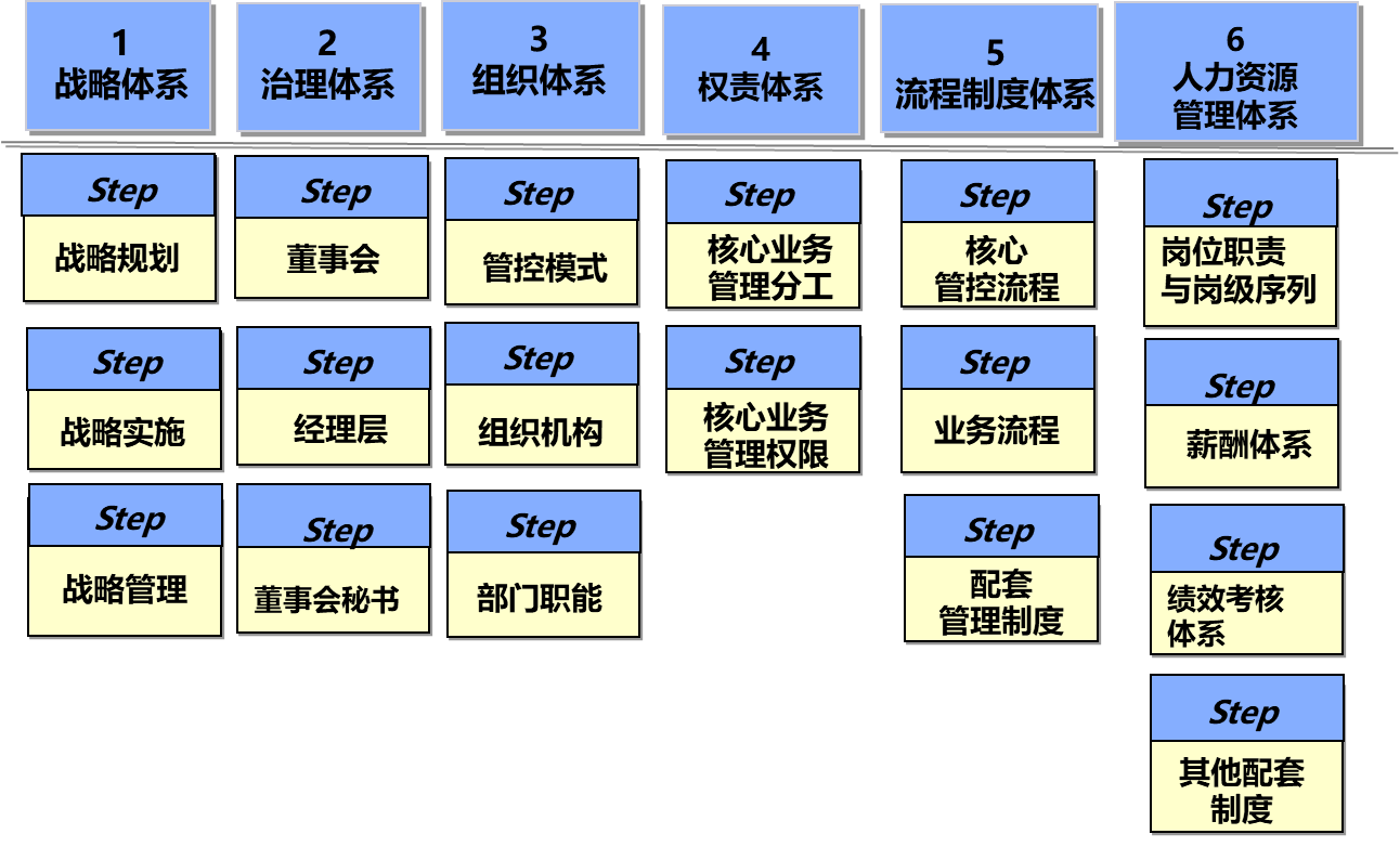 • 完善流程制度體系建設(shè)。在部門職能及崗位清晰的基礎(chǔ)上,設(shè)計企業(yè)的制度管理體系。以橫向分類、縱向分級,橫到邊、縱到底的制度體系設(shè)計作為企業(yè)管理運營的工作基礎(chǔ),并在制度體系設(shè)計基礎(chǔ)上,設(shè)計相應(yīng)的流程體系。