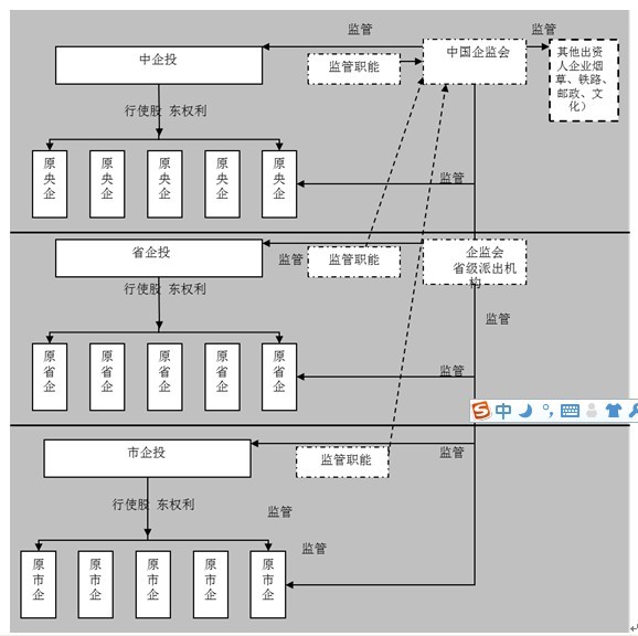 未來模式下,國資委或消亡或發(fā)展成為全國性的企業(yè)國資監(jiān)管人——中國企監(jiān)會,行使“權(quán)力”,對全國各類企業(yè)國有資本——無論是“中企投”系統(tǒng)的企業(yè)國有資本,還是“省企投”體系的企業(yè)國有資本,也無論是原國資委系統(tǒng)的企業(yè)國有資本,還是其他出資人(如煙草、文化、郵政、鐵路等系統(tǒng))企業(yè)國有資本——進行監(jiān)管。同時,政府之于企業(yè)的市場行為,也為中國企監(jiān)會所監(jiān)督。