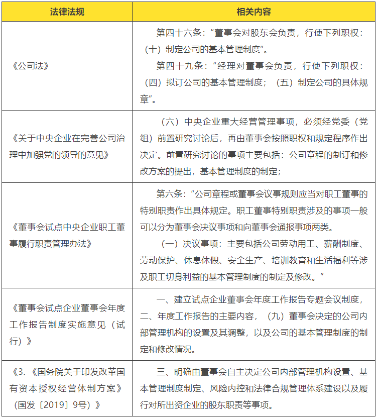 關(guān)于公司基本管理制度,《公司法》第四十六條:“董事會(huì)對(duì)股東會(huì)負(fù)責(zé),行使下列職權(quán):(十)制定公司的基本管理制度”,《公司法》第四十九條:“經(jīng)理對(duì)董事會(huì)負(fù)責(zé),行使下列職權(quán):(四)擬訂公司的基本管理制度”。由此可見,公司基本管理制度是董事會(huì)和經(jīng)理職權(quán)的重要職權(quán)之一,但是在查閱相關(guān)法律法規(guī)政策文件之后,發(fā)現(xiàn)并沒有明確公司基本管理制度具體有哪些。與此同時(shí),在實(shí)際咨詢活動(dòng)開展過程中,也發(fā)現(xiàn)咨詢客戶提出類似的疑問,這就為企業(yè)管理人員實(shí)際操作過程中帶來困惑,成為需要解決的實(shí)際問題。