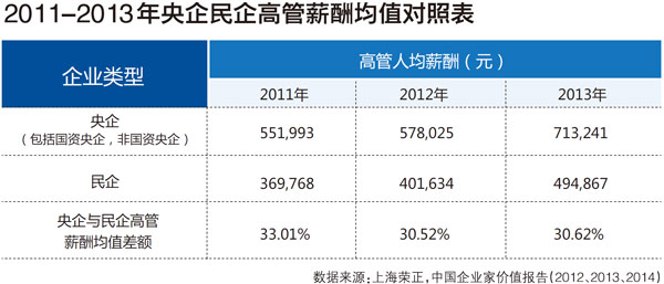 從以上數(shù)據(jù)可以看出,央企高管薪酬均值連續(xù)3年高出民企高管薪酬30%左右,以上央企中包括薪酬水平居前的金融類央企,民企樣本涵蓋了大部分中小板及創(chuàng)業(yè)板樣本,企業(yè)從規(guī)模、股本、行業(yè)等方面都存在較大的區(qū)別。