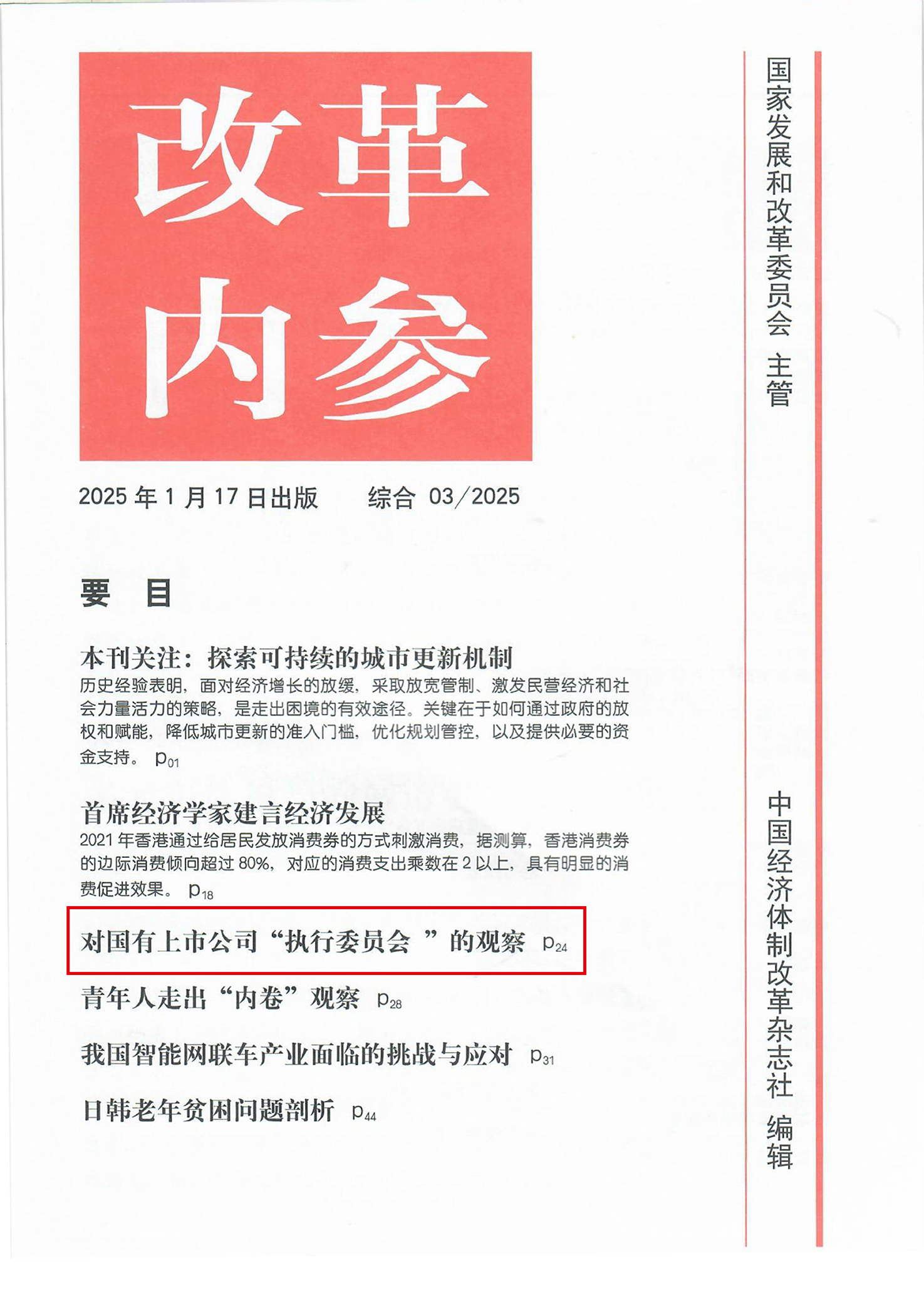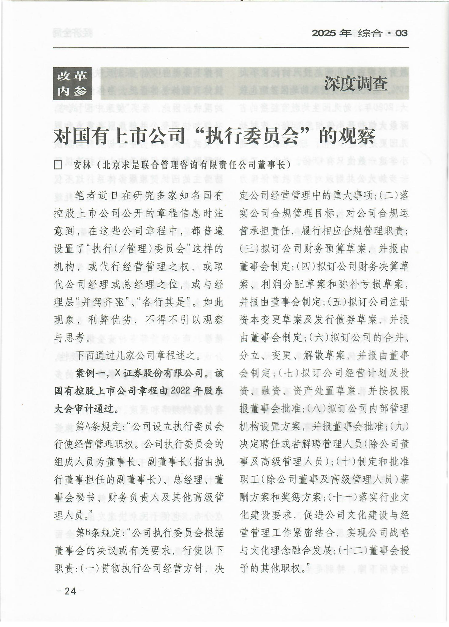 2025年01月17日,求是咨詢董事長(zhǎng)安林博士撰文《對(duì)國(guó)有上市公司“執(zhí)行委員會(huì)”的觀察》刊發(fā)于《改革內(nèi)參》。文章原文可關(guān)注“求是咨詢”官方微信公眾號(hào)進(jìn)行閱讀。
