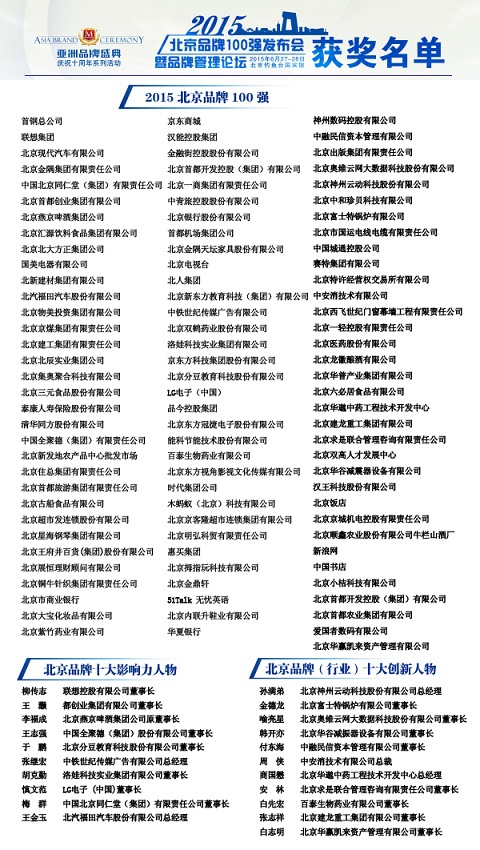 北京求是聯(lián)合管理咨詢有限責(zé)任公司、首鋼總公司、聯(lián)想集團(tuán)、北京現(xiàn)代汽車有限公司、北京金隅集團(tuán)有限責(zé)任公司、中國北京同仁堂(集團(tuán))有限責(zé)任公司、北京全聚德(集團(tuán))有限責(zé)任公司、清華同方股份有限公司、北京北大方正集團(tuán)公司、北京首都創(chuàng)業(yè)集團(tuán)有限公司、北京燕京啤酒集團(tuán)公司、北京匯源飲料食品集團(tuán)有限公司、北京古船食品有限公司、北京大寶化妝品有限公司、北京物美投資集團(tuán)有限公司、國美電器有限公司、北京金融街控股股份有限公司、京東商城、北京王府井百貨(集團(tuán))股份有限公司、北京新東方教育科技(集團(tuán))有限公司、首都機(jī)場集團(tuán)公司、北京電視臺、北京銀行股份有限公司、新浪網(wǎng)、華夏銀行、中青旅控股股份有限公司、神州數(shù)碼控股有限公司、北京金鼎軒酒樓有限責(zé)任公司、北京銅牛針織集團(tuán)公司等榮獲“2015北京品牌100強(qiáng)"。