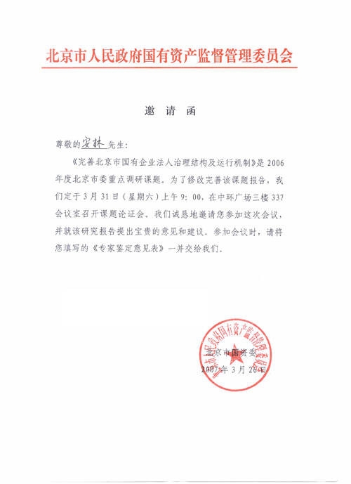 求是咨詢董事長安林博士受邀,擔(dān)任北京市國資委《完善北京市國有企業(yè)法人治理結(jié)構(gòu)及運(yùn)行機(jī)制》課題評審專家。