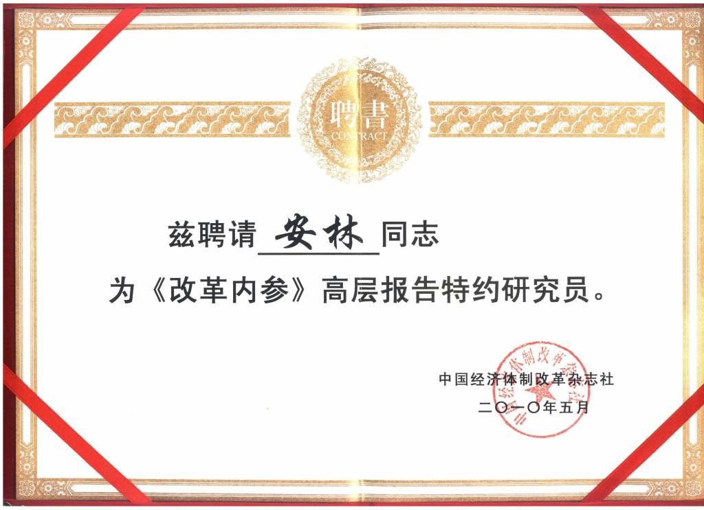 2011年9月4日,由中國(guó)經(jīng)濟(jì)體制改革雜志社、《改革內(nèi)參》高層報(bào)告編輯部主辦的“《改革內(nèi)參》高層報(bào)告特約專家/研究員首屆會(huì)議”,在北京友誼賓館嘉賓樓隆重舉行。我司董事長(zhǎng)安林博士作為中國(guó)國(guó)資與國(guó)企改革咨詢研究專家,被聘為《改革內(nèi)參》高層報(bào)告特約研究員。