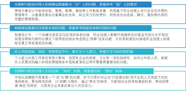 那么對于國資委推進國有企業(yè)改革的重大舉措,其中就包含經理層成員任期制和契約化管理及職業(yè)經理人制度建設。一方面,經理層成員任期制和契約化管理及職業(yè)經理人制度建設是建立有效國有企業(yè)公司治理機制的重要途徑。另一方面,在現(xiàn)代國有企業(yè)制度中,“三會一層”等公司議事管理規(guī)則的有效實施,也離不開經理層成員任期制和契約化管理及經理人制度建設。