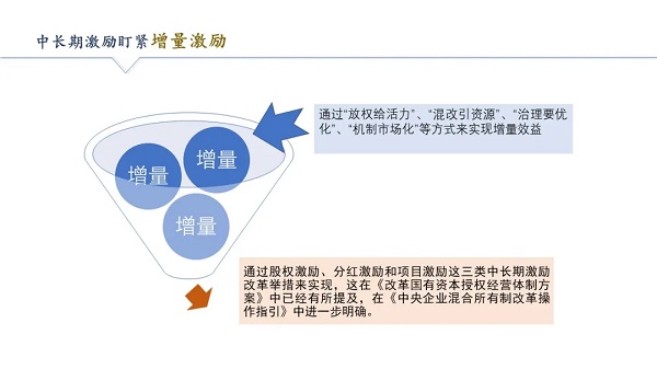 此次國企改革中的強化激勵的著眼點是增量效益激勵,這與基于存量效益的工資總額管理制度迥然不同。增量效益激勵又分兩部分:一是如何實現(xiàn)增量效益,主要通過“放權給活力”、“混改引資源”、“治理要優(yōu)化”、“機制市場化”等方式來實現(xiàn)增量效益;二是如何對增量效益進行分配,主要是通過股權激勵、分紅激勵和項目激勵這三類中長期激勵改革舉措來實現(xiàn),這在《改革國有資本授權經營體制方案》中已經有所提及,在《中央企業(yè)混合所有制改革操作指引》中進一步明確。