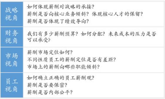 明確薪酬設(shè)計需要關(guān)注的重點——從戰(zhàn)略、員工、市場及財務(wù)四個維度全面評估現(xiàn)有薪酬體系。薪酬激勵的核心在于通過對薪酬體系的設(shè)定,激發(fā)員工工作積極性從而實現(xiàn)公司經(jīng)營目標。