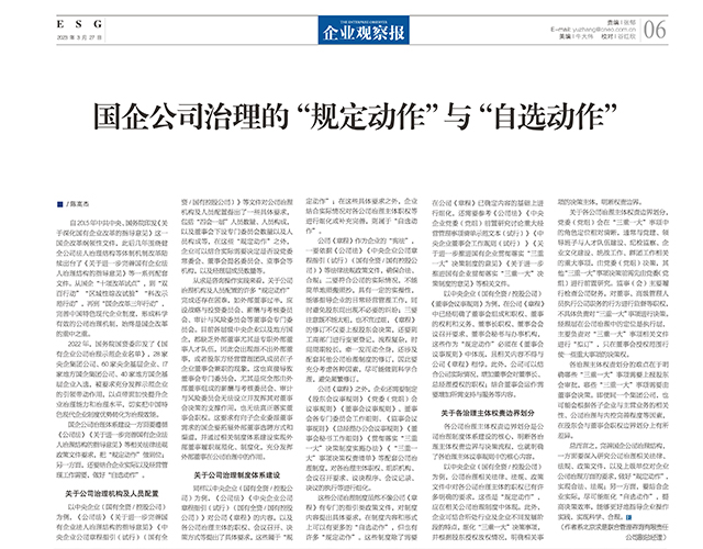 2023年3月27日,求是咨詢副總經(jīng)理陳高杰撰文《國(guó)企公司治理的“規(guī)定動(dòng)作”與“自選動(dòng)作”》刊發(fā)于《企業(yè)觀察報(bào)》。